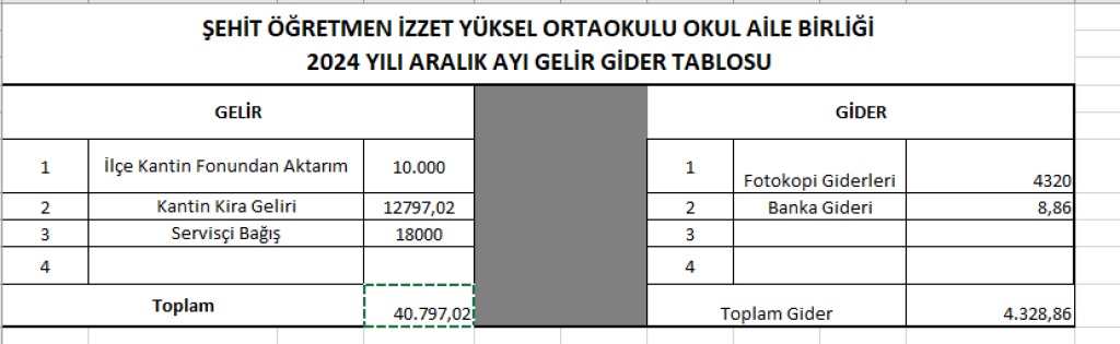 2024 YILI ARALIK AYI GELİR-GİDER TABLOSU