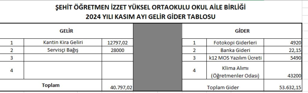 2024 YILI KASIM AYI GELİR-GİDER TABLOSU
