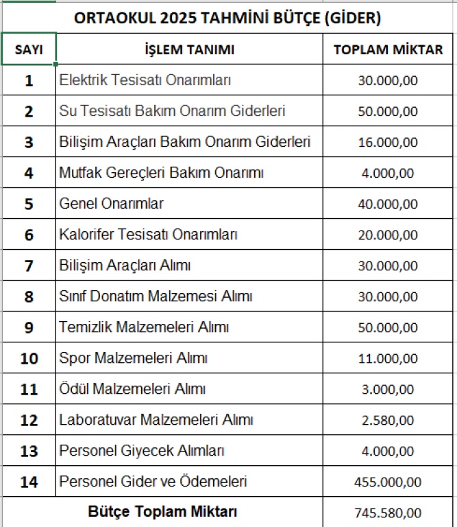 2025 YILI TAHMİNİ BÜTÇE GELİR-GİDER TABLOSU